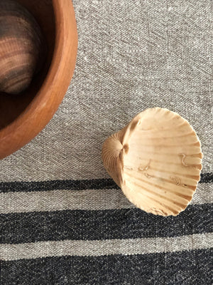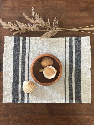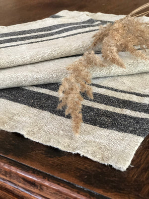 A rustic, French stripe inspired set of 6 100% pure linen placemats.