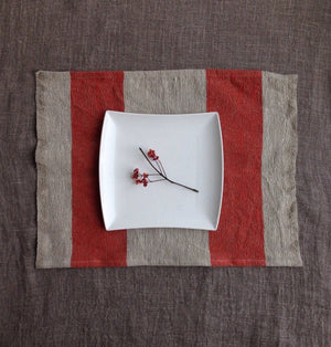 Set of 6 rustic linen placemats featuring wide red stripes. Perfect for your Christmas table. Made from 100% pure European, yearn dyed linen.
