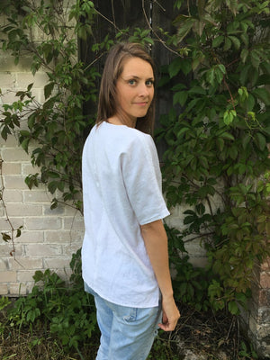 Simple and comfortable white linen top with midi length sleeves that can be rolled up or kept at above-elbow length. The top also features two short slits on the sides.