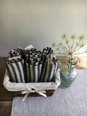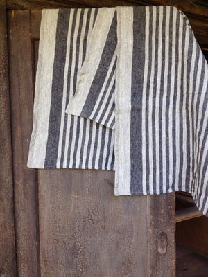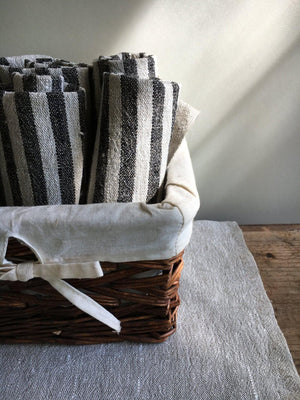 Raw, earthy linen woven from thick linen threads, yearn dyed in black in combination with natural taupe linen stripes.