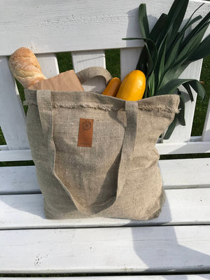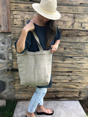 This is a simple and sturdy linen tote bag made from rustic linen burlap with a lovely frayed edge decor.
