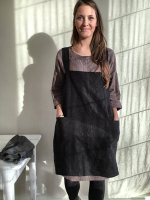 Made from medium weight black European high quality linen it will be perfect for you to wear at home, in the garden, studio or add to your everyday wardrobe.