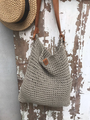 Rustic and raw, this is a shoulder tote bag made from 100% pure linen thread. Features a leather strap.