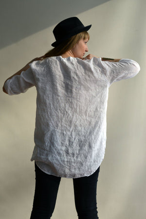 This is a comfortable loose linen tunic top with long sleeves and two patch pockets.