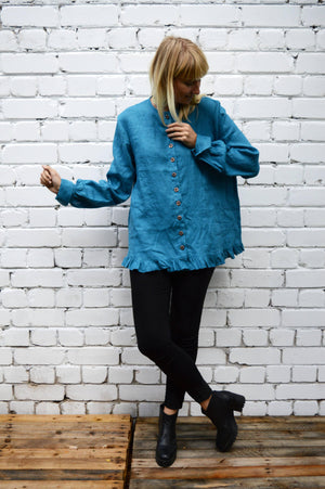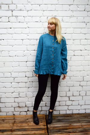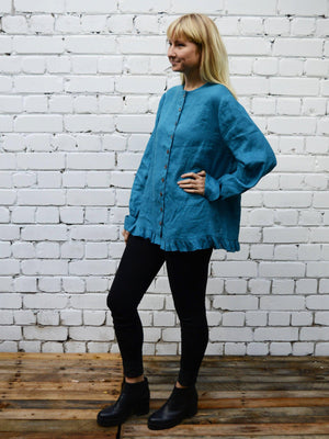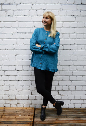 Lovely button up linen jacket top with small ruffle hem and lovely cuff detail. Loose cut past your hip.