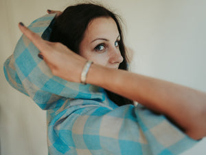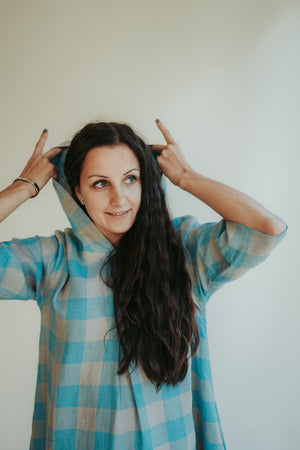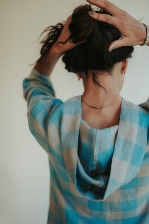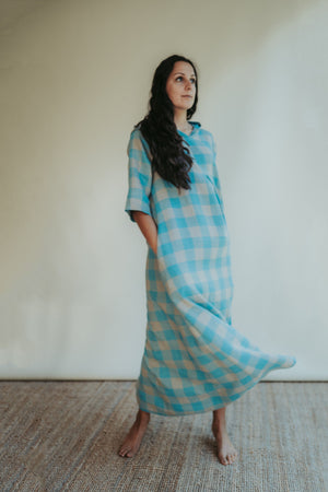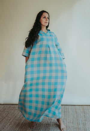 Features handy pockets. In the images you see the kaftan made from 'Turquoise Check' linen which is the first option in the color menu.