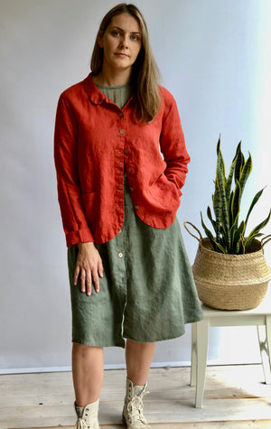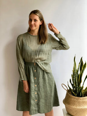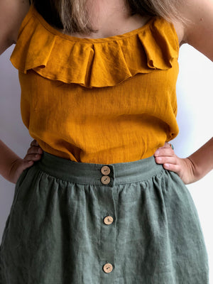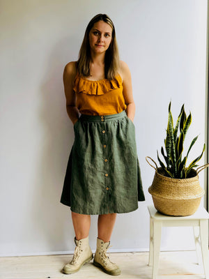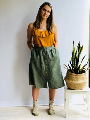 Bring back the 60s! Fun and comfortable linen midi skirt with pockets and buttons.