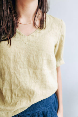 Very comfortable natural linen top with V shaped neck and elbow length sleeves.