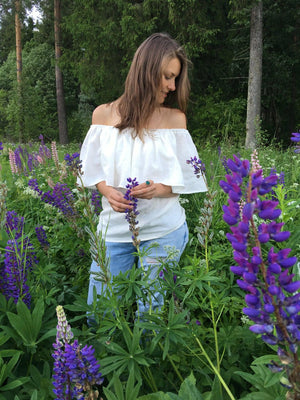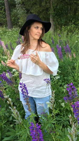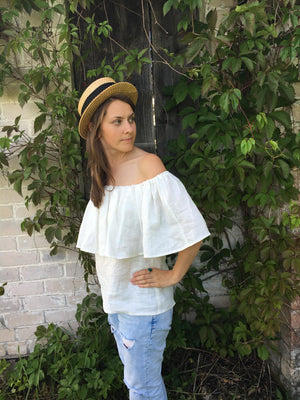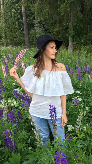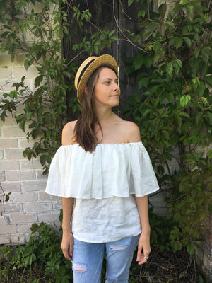 Dreamy off the shoulder bardot frill top made from airy and pure European linen.