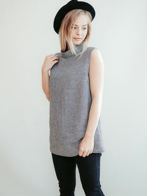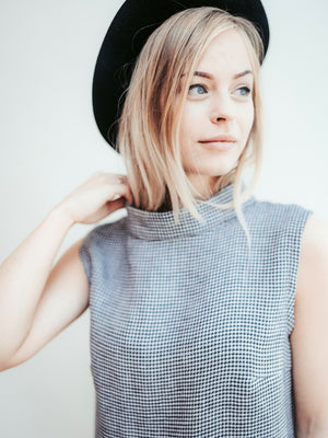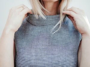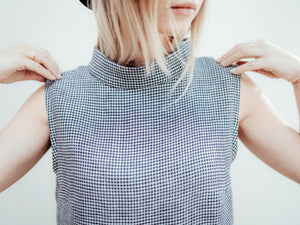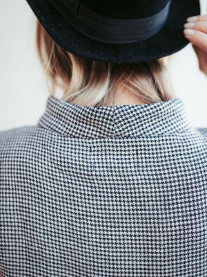 The raised mock neck elevates the look giving an elegant 1960s feel. The simple lines of the slight A shaped silhouette make it a comfortable yet elegant piece to wear.