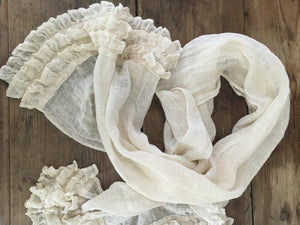 The endings of the scarf have three small decorative ruffles. Rustic but elegant look.