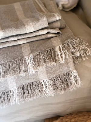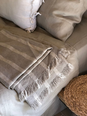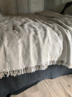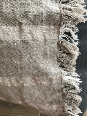 Beautiful and heavy linen throw with stripes in lighter creamy brown colours and fringed edges.