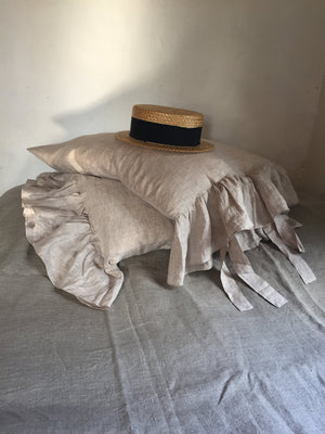 Adorable two linen pillowcases with ruffles. Made from 100%, very fine linen. Pre-washed to ensure that they are lovingly soft to your touch and wrinkled in charming manner.