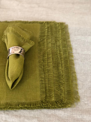 A beautiful set of six green napkins with frayed edges. Made from a fantastic, textured 100% pure European linen. Available also in a beautiful Christmas Red.
