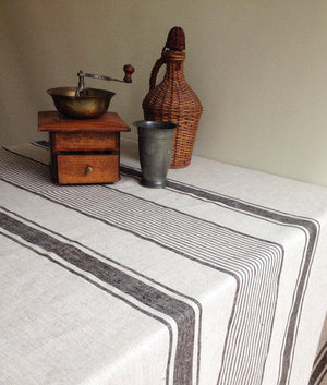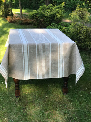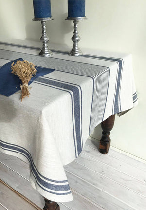 French country style linen tablecloth with bright blue ticking stripes. The base is a natural light taupe.