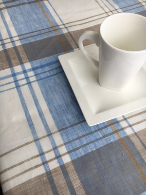 This is a lovely linen tablecloth woven in blue and light brown tartan pattern. Made from 100% pure medium weight excellent quality European linen.
