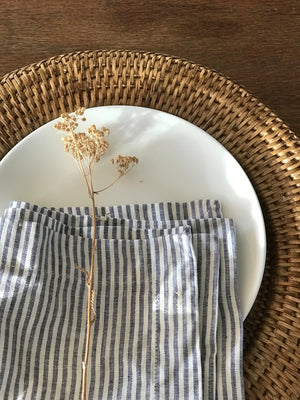 Set of fourteen adorable thin striped linen cloth napkins made from beautiful natural linen. Soft white and blue/grey stripes.
