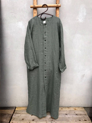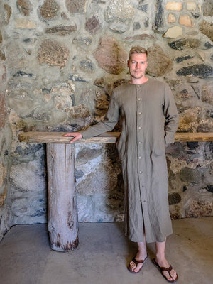 Button up kaftan made from 100% pure linen. Has two handy pockets in the side seams and slits on the sides.