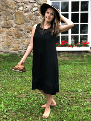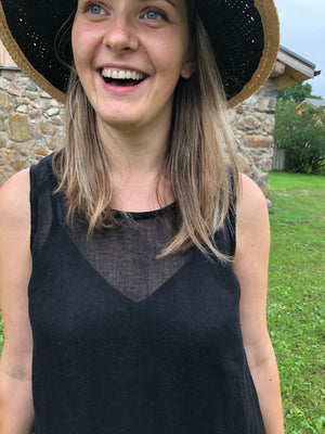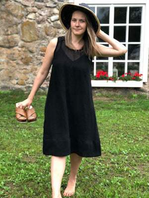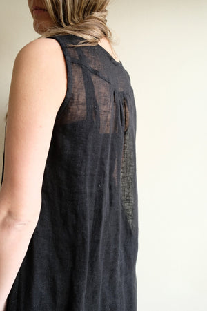 Soft gauze linen dress to wear over a slip dress or as a cover up. With a lovely detail on the back and a wide bottom hem.