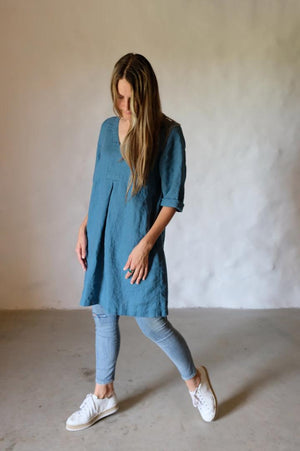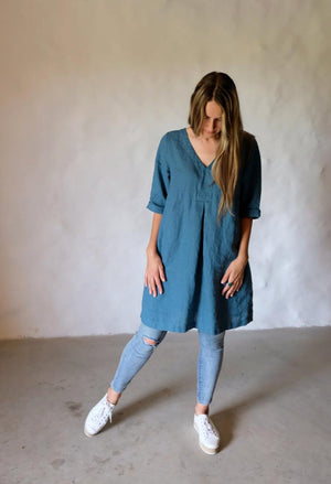 Loosely fitted very comfortable linen tunic dress with V shaped neck. Wear it with legging, trousers or as is.