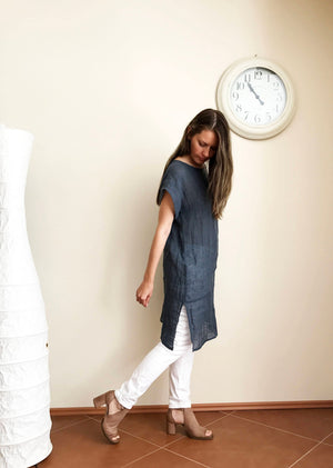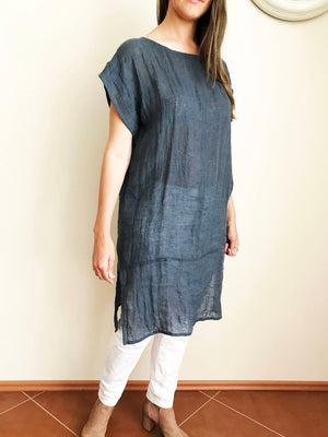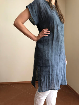 Rustic but soft and gauzy linen coverup tunic. Excellent for layering and as a stylish cover. Lightweight with shirt sleeves and cute slits on the sides.