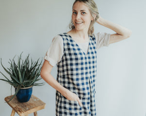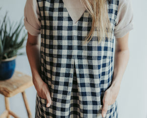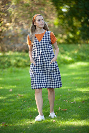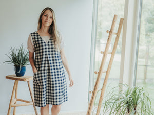No zipper or buttons - just put it on and dive into your day with style and comfort! In the images you see the dress made from 'Navy Chequered' linen- the first choice in the color menu.