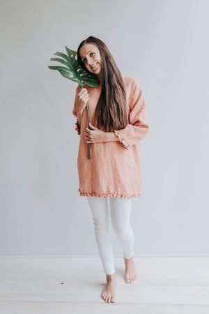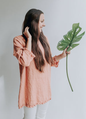 In the images the tunic is made from 'Soft Salmon' colored linen.