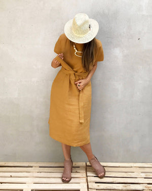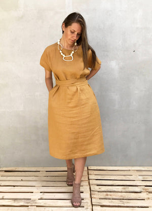 Simple and elegant lines and a loose fit that can be brought together with a belt accompanying the dress. In seam pockets will ensure that you always have a place to put your phone or keys.