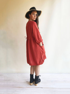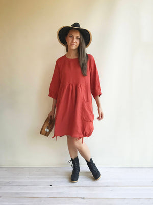 Loose linen dress that feels feminine due to lovely detailing feels absolutely comfortable with handy patch pockets.