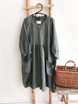 Feminine yet comfortable linen tunic dress with handy patch pockets. Choose from various colors available.