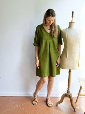 Loosely fitted very comfortable linen tunic dress with V shaped neck. Wear it with legging, trousers or as is.
