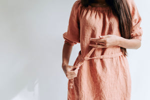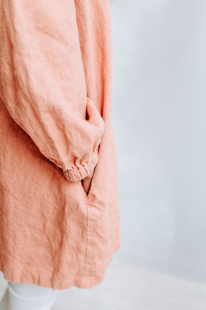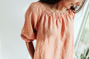 Feminine and versatile linen tunic with elastic gather through the neckline and sleeves. Comes with a matching linen belt.