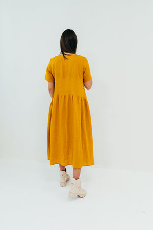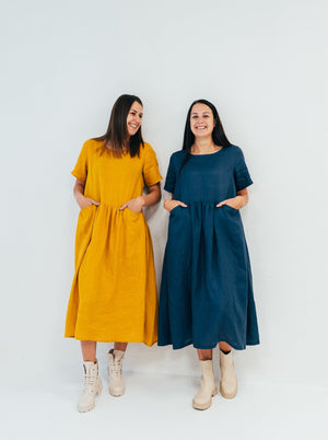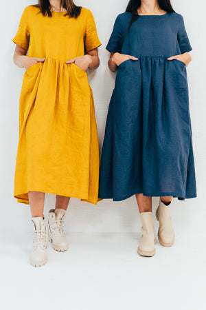 In the images you see the dresses made from medium weight linen in mustard and dark navy colors (both are slightly darker in life).