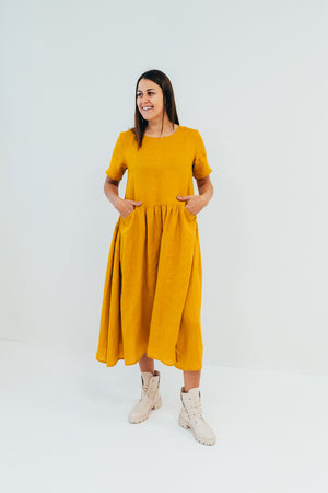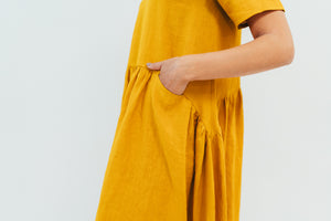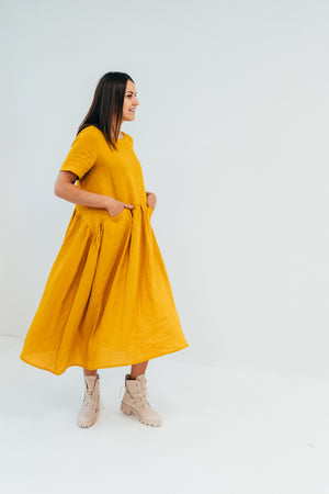 Comfortable, loose linen dress with two inseam pockets at slight raised waist line.