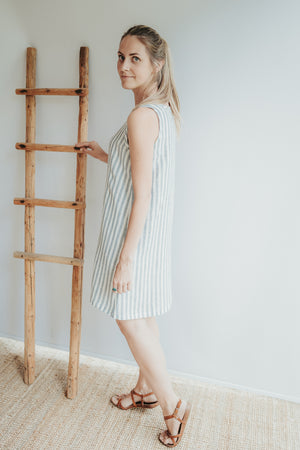 A simple and fun linen jumper dress with a lovely A cut and beautifully finished trims around the hems.