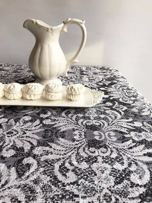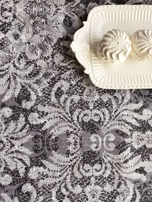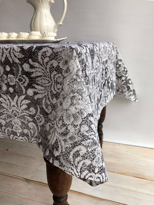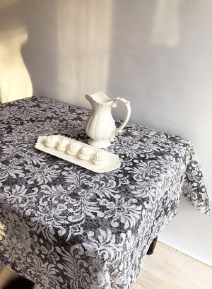 This is a 100% linen tablecloth with beautiful black and silver grey lace like patterns.
