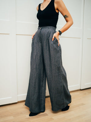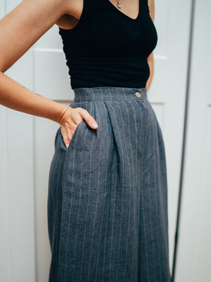 In the photos you see the pants in grey striped medium weight linen.