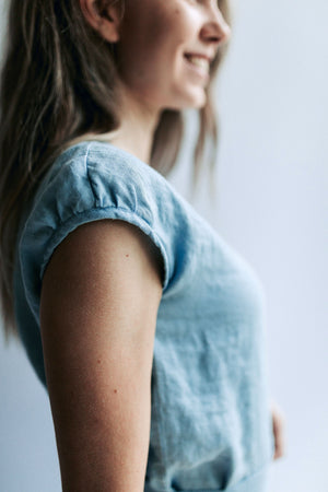 Beautiful short sleeve detail. Comes with a matching linen belt so you can vary the looks by accentuating your waist line.