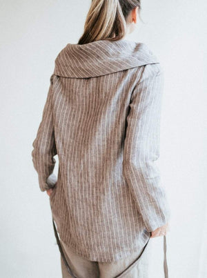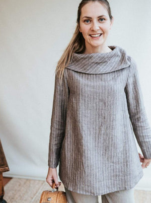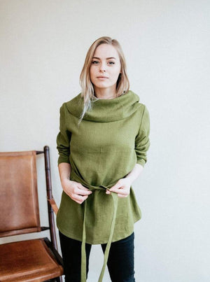 Elegant linen tunic with a beautiful raised collar. Very comfortable, simple and clean style, with long sleeves. Flattering shilouette covering hip area. The tunic top comes with an accompanying belt.