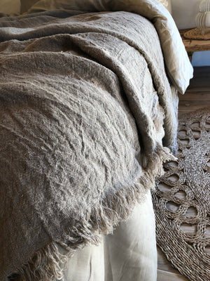 Rustic, richly textured linen throw with fringes made from 100% pure linen woven in a thick weave. The color of this throw is natural linen taupe - it is not pure grey, nor pure brown, but a mix between. This linen fabric is not dyed. Pure natural look.