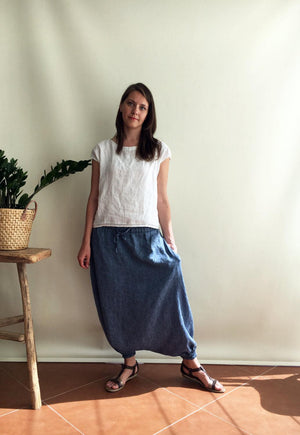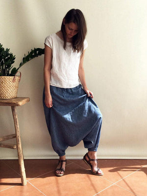 Super comfortable harem pants made from 100% pure linen. Choose from many colors available. In particular we recommend light weight linens which will drape wonderfully without the risk of looking bulky. Medium linens we recommend only for smaller sizes.
