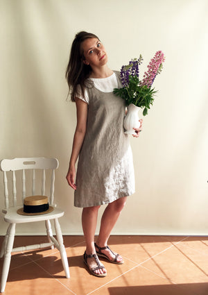 Your go to linen jumper dress with a simple cut and handy in seam pockets. Wear it alone or with a shirt underneath.