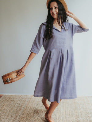 Joie de vivre type of linen dress with it's sailor inspired collar and pleated skirt part! The dress is a loose fit with drop shoulders.