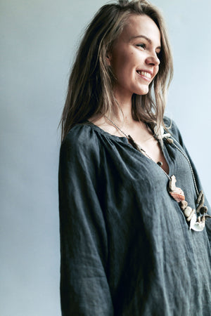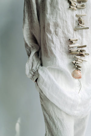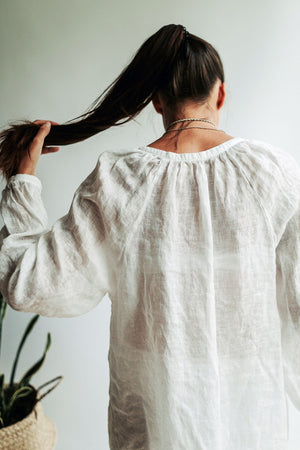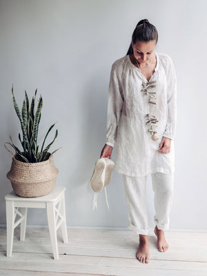 Sensual and airy. This light linen shirt is wonderful for hot summer days, milky evenings and dreamy nights. Made from light weight, pure linen with beautiful gather at cuffs and neckline.