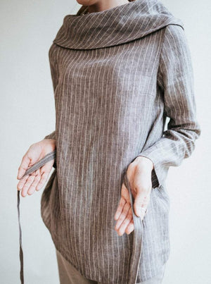 Linen tunic with a beautiful raised collar. Very comfortable and stylish, with long sleeves and comes with an accompanying belt.