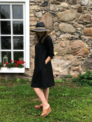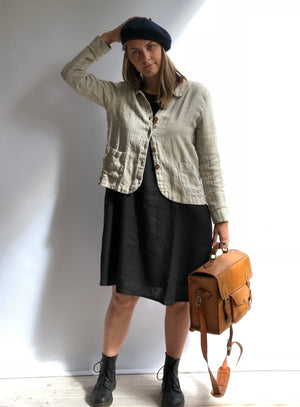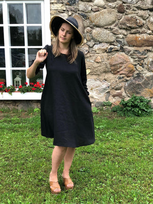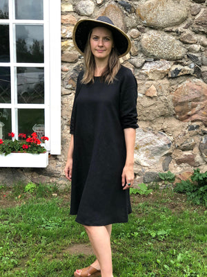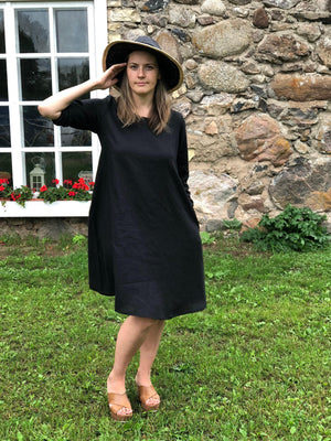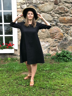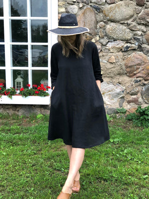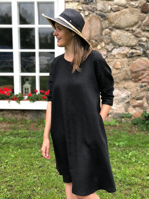 A version of 'little black dress' in linen. Perfect for all occasions - beautiful A shape, long sleeves, and a cut round neckline. It has a comfortable loose fit and you can choose to have it in black or any other color from our sample list. Truly versatile piece.