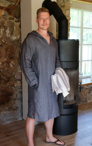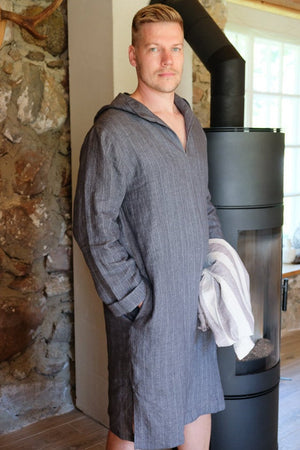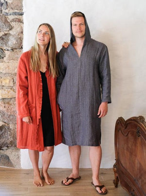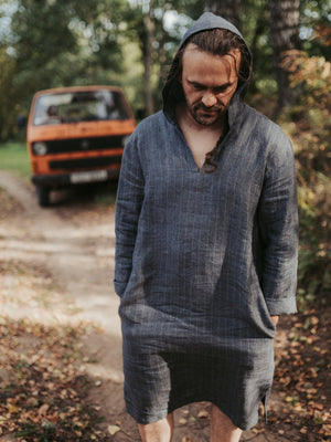 Linen kaftans for men are a great choice for loungewear around the house, after the gym, walking the dog or you name it. Those who wear them, love them. This linen kaftan for men features two inseam pockets and a hood making it an incredibly comfortable choice. The length is over-the-knee and has two slits for greater comfort of movement.