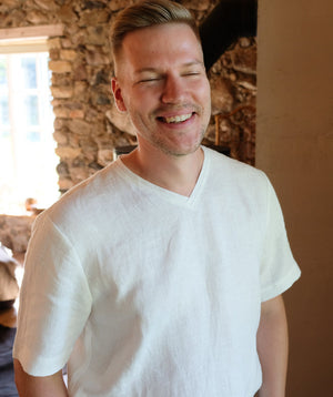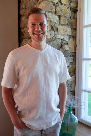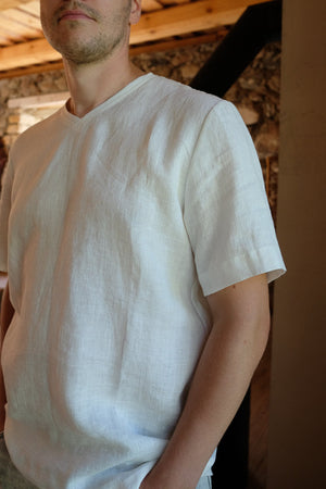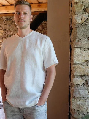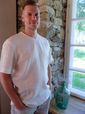 Simple & natural. This linen t-shirt with v-neck is made with the man who loves genuinely good products in mind. Casual, but always well dressed. The minimal style of the shirt will allow for versatile matching. A true staple in ones wardrobe.