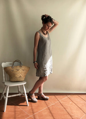 Your go to linen jumper dress with a simple cut and handy in seam pockets. Wear it alone or with a shirt underneath.
