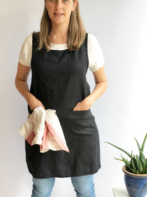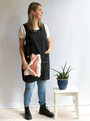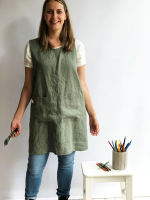 This cute linen pinafore apron will be the perfect coverup while cooking, playing with children, in the garden or in your creative studio. With handy split pocket in front.